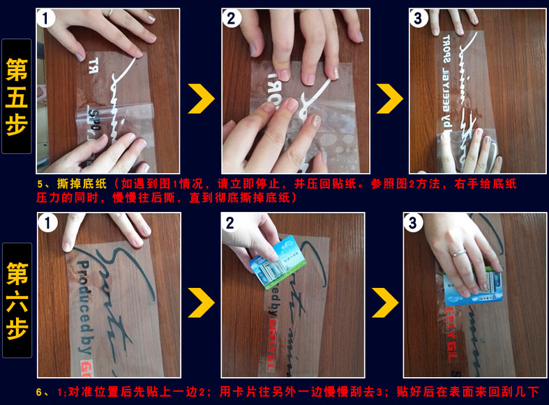 三、請(qǐng)注意:車貼正確的揭開方法是先揭底紙,而不是直接撕轉(zhuǎn)移膜。揭底紙的時(shí)候一定要慢慢的操作,速度以車貼不粘在黃色底紙上為宜。