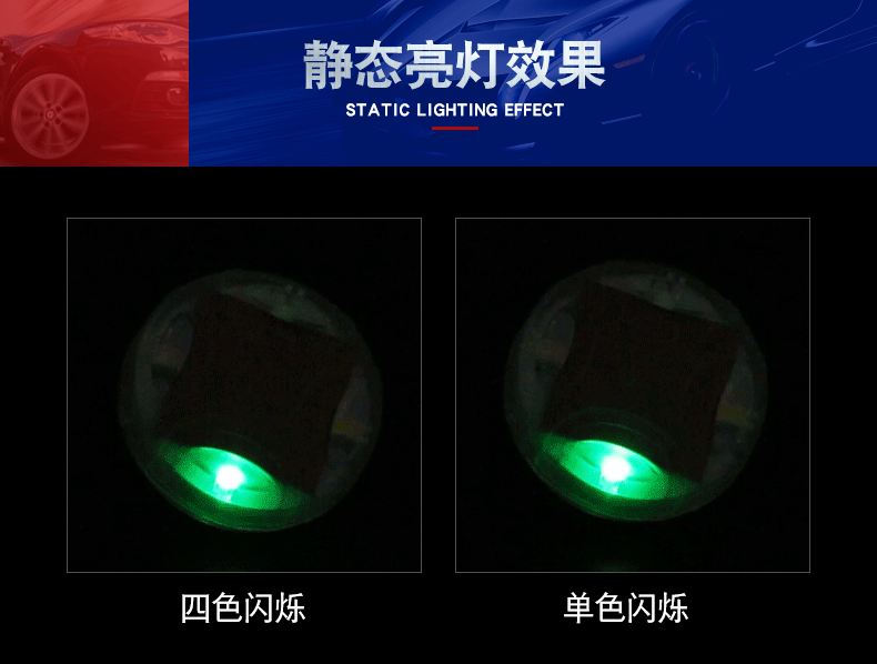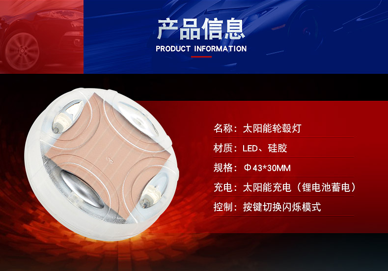 太陽能氣門嘴燈是一款xin型的汽車用品,該產品體積小、重量輕、安裝簡便,產品使用太陽能充電,無需更換電池,電力持久耐用。將產品安裝于輪胎氣門嘴上,夜晚行車時燈光功能自動打開,能夠使側面人、車及早發(fā)現(xiàn),避免或減少交通事故,提高夜晚行車安全,同時也能裝扮愛車,屬于汽車輪轂裝飾產品