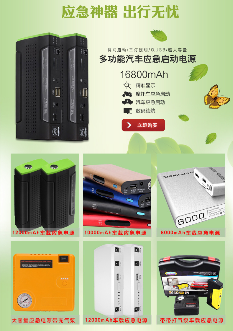 | 功能 | 1.啟動(dòng)12V汽油車(≤6000CC) 2.給手機(jī)等數(shù)碼產(chǎn)品充電 3.給筆記本電腦、車載電冰箱充電等 4.LED燈照明、爆閃、SOS求救信號(hào) |