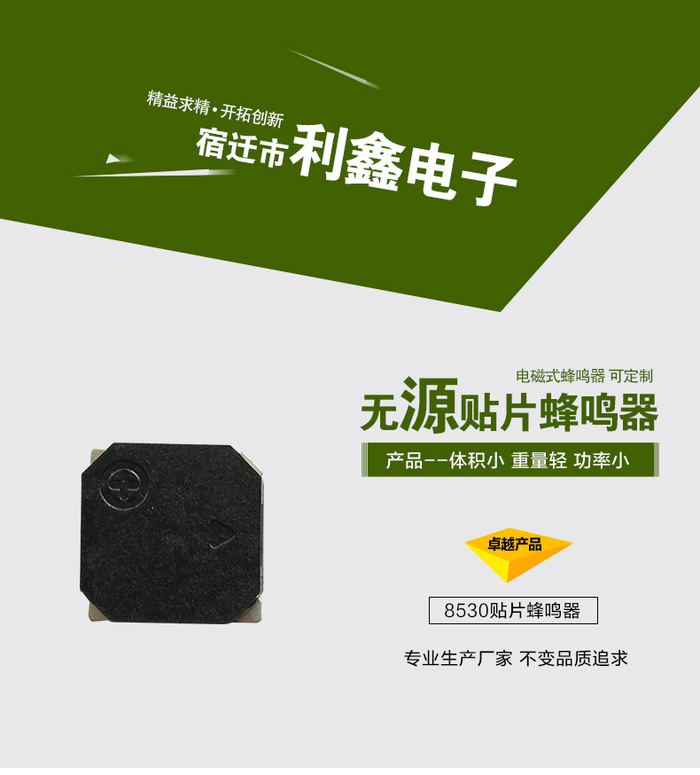 利鑫電子有限公司是開(kāi)發(fā)和生產(chǎn)電子蜂鳴器的專業(yè)企業(yè)。工廠生產(chǎn)的蜂鳴器有三大系列六十幾種規(guī)格。分別是: