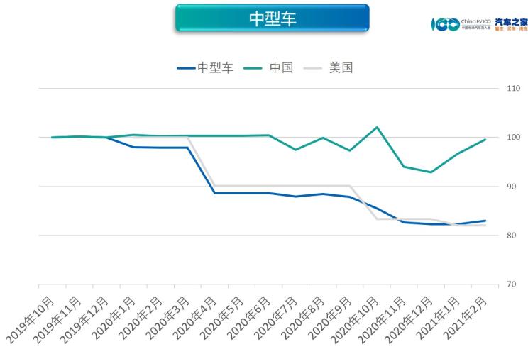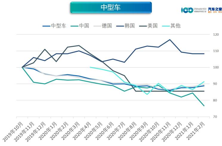 2月,中型車市場價(jià)格指數(shù)為88.81,同比下降7.10%,環(huán)比上升1.24%。分國別看,除中國(-9%)環(huán)比下跌以外,其他車型(+6%)、德系(+1%)環(huán)比上漲,韓系、美系持平。