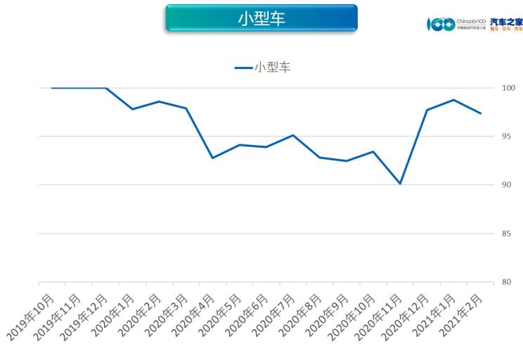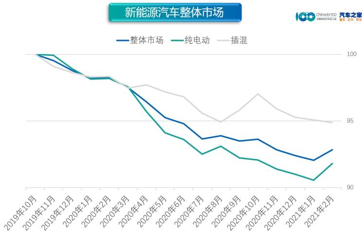 2月,純電動的強(qiáng)勢表現(xiàn)帶動整體市場價(jià)格指數(shù)上升。2021年2月,純電動價(jià)格指數(shù)為91.80,環(huán)比上漲1.37%,同比上漲6.51%;插混(含增程式)價(jià)格指數(shù)為94.87,環(huán)比下降0.22%,同比下降3.52%。