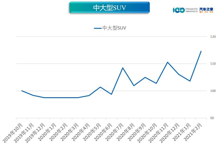 中大型SUV市場價(jià)格指數(shù)為114.58,同比上漲17.51%,環(huán)比上漲10.60%。細(xì)分市場整體均價(jià)為53.42萬元,較上月漲5.12萬元,較去年同期漲9.79萬元。