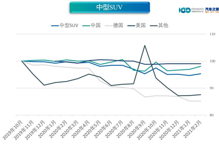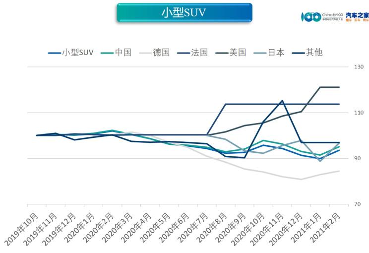 2月,小型SUV市場價(jià)格指數(shù)為93.53,同比下降8.27%,環(huán)比上升4.02%。分國別看,除法系、美系、其他車型持平以外,日系(+9%)、中國(+4%)、德系(+2%)均環(huán)比上漲。