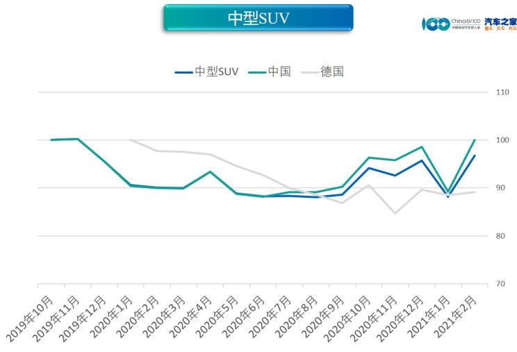 中型SUV市場價(jià)格指數(shù)為96.76,同比上升7.48%,環(huán)比上升9.80%。分國別看,中國(+12.10%)環(huán)比領(lǐng)漲,德系(+0.70%)環(huán)比微漲。