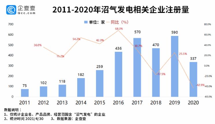 從近十年沼氣發(fā)電相關(guān)企業(yè)發(fā)展狀況來看,數(shù)據(jù)顯示,2011-2017年企業(yè)注冊量不斷增長,2017年注冊量達到570家,同比增長30.7%。2019年注冊量達到590家,為近十年注冊量的高峰。2020年注冊量出現(xiàn)回落,全年新注冊企業(yè)337家,同比下降了42.9%。