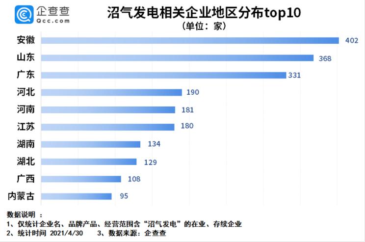 從地域分布來看,目前我國在業(yè)、存續(xù)的沼氣發(fā)電相關(guān)企業(yè)主要分布在安徽、山東、廣東等省份。其中安徽省以402家排名全國第一,山東、廣東分別以368家、331家位列二三名。此外,河北、河南、江蘇、湖南、湖北、廣西等省份也均超過了100家。