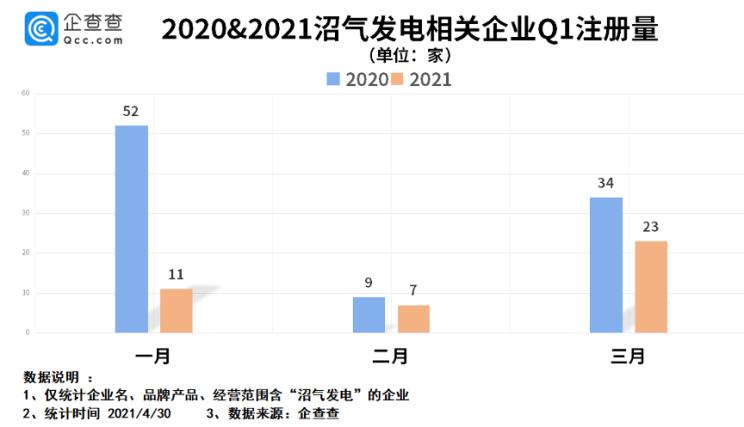 2021年第一季度,我國沼氣發(fā)電相關(guān)企業(yè)注冊量為41家,同比下降了86.5%。其中,1-3月份注冊量分別為11家、7家和23家。
