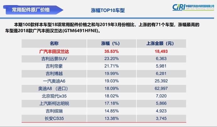 報(bào)告顯示,本期常用配件負(fù)擔(dān) 100 指數(shù)為 17.31,較上期 2019 年 3 月的數(shù)值增加 1.15,18 項(xiàng)常用配件中有 17 項(xiàng)配件價(jià)格均值高于 2019 年 3 月水平,漲幅最高的車型是 2018 款廣汽豐田漢蘭達(dá)。