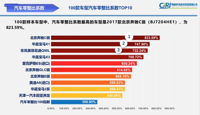 其中,均值指數(shù)為 350.93%,最高值為 823.59%,為奔馳 C 級(jí)車型,也就是說(shuō)北京奔馳 C 級(jí)所有裝車配件價(jià)格加起來(lái)與八輛整車的價(jià)格相當(dāng),不僅如此,排名前十中,奔馳就有三款,另外兩款是奔馳 GLC、北京奔馳 E 級(jí)。