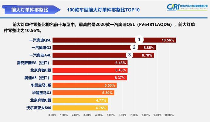 前保險(xiǎn)杠皮單件零整比排名前十車型中,最高的是 2018 款一汽奧迪 A4L,零整比為 2.92%,型前大燈單件零整比的均值為 2.29%,最高值為 10.56%,是 2020 款?yuàn)W迪 Q5L,相當(dāng)于 9.47 個(gè)前大燈就可以買一輛新車!