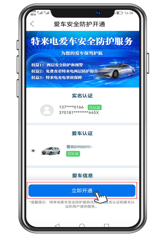 3.下翻到底,點擊“開通服務(wù)”,進(jìn)行愛車和實名認(rèn)證,填寫相關(guān)信息后點擊“立即開通”。