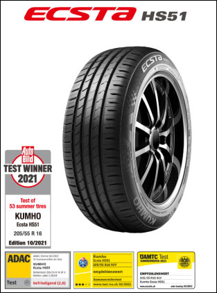 2021AutoBild以205/55R16尺寸進行夏季輪胎測試,這是歐洲汽車標準中常見的尺寸,也是大眾高爾夫和奧迪A3等熱門車的配套輪胎。本期測試分兩階段進行:第一輪測試是在德國ATP(帕本堡汽車測試場)進行,首輪干濕地剎車測試中,有33款輪胎被淘汰,錦湖翼馳達EcstaHS51以第三名的成績名列前茅。第二輪測試在西班牙的Applus+IDIADA場地進行,第一輪晉級的20款輪胎角逐排名。錦湖翼馳達EcstaHS51因其幾乎在各個測試項目中都擁有超高競爭力和一致的好成績,在20款輪胎中排名靠前,馬牌PremiumContact6、SemperitSpeedLife3、DebicaPrestoHP2、BridgestoneTuranzaT005依次獲第二至第五名。