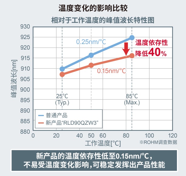 新產(chǎn)品“RLD90QZW3”利用ROHM激光二極管元器件開發(fā)相關(guān)的專利技術(shù),作為LiDAR用的75W高輸出功率激光二極管,實現(xiàn)了225μm的業(yè)界超窄線寬。通過高密度發(fā)光實現(xiàn)了高光束性能。此外,除了在整個線寬范圍成功地使發(fā)光強度更均勻外,激光波長的溫度依存性低至0.15nm/℃,不易受溫度變化的影響,因此可穩(wěn)定地發(fā)揮其性能。