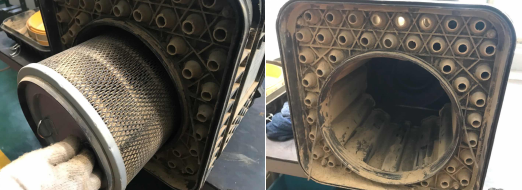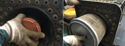 3、清理空氣濾清器一側(cè)的排灰閥,排除里面的灰塵。用氣槍清理濾芯時(shí),要沿濾芯內(nèi)側(cè)向外側(cè)清理,切不可由外向內(nèi)吹(氣槍壓力在0.2MPa),請(qǐng)注意:濾芯在清理六次后應(yīng)進(jìn)行更換。