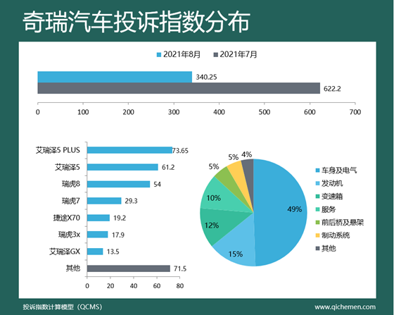 汽車質(zhì)量投訴點評:本月奇瑞汽車投訴指數(shù)環(huán)比下滑45.32%,排名下滑至第七名,曾經(jīng)的捷途宣傳與實際不符、瑞虎8大燈盲區(qū)大等集中投訴事件出現(xiàn)退潮跡象,成為奇瑞汽車投訴指數(shù)下滑的主要原因;不過艾瑞澤5、艾瑞澤5 PLUS的車身生銹、行車記錄儀模糊問題仍是投訴主力,瑞虎8大燈盲區(qū)大問題也有少許殘留,車身及電氣層面投訴占比達(dá)到49%。