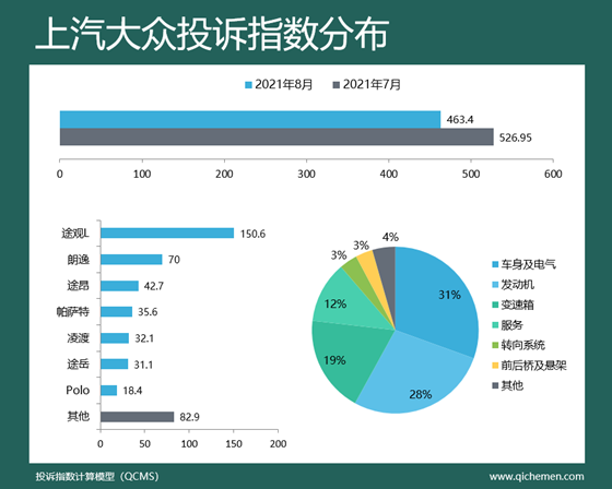汽車質(zhì)量投訴點評:本月上汽大眾投訴指數(shù)環(huán)比下滑12.06%,排名滑落至第四位;質(zhì)量問題集中于車身及電氣、發(fā)動機、變速箱層面,分別占比31%、28%、19%;其中,途觀L因顆粒捕捉器堵塞排名車型投訴榜單首位,該問題投訴已達(dá)數(shù)月至今沒有完美解決方案;此外,變速箱異響問題在上汽大眾多款車型中存在,凌渡、帕薩特表現(xiàn)明顯。