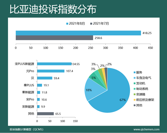 汽車質(zhì)量投訴點評:本月比亞迪因旗下宋PLUS新能源、元PRO、漢三款車型遭遇集中投訴,投訴指數(shù)環(huán)比增長61.74%,排名升至第五位;其中,宋PLUS新能源、元PRO投訴問題都出在新車上,宋PLUS新能源因為訂單量大無法按時交車被集中投訴,元Pro則因新車價格下降引發(fā)老款車主不滿;比亞迪漢因車機卡頓遭遇集中投訴。