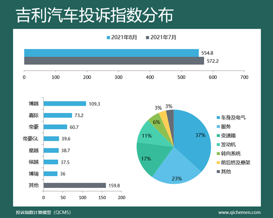 汽車質(zhì)量投訴點評:本月吉利汽車投訴指數(shù)有微弱的下滑,仍保持第二位置;博越、嘉際、帝豪處于投訴車型第一梯隊,都涉及有車機問題,帝豪GL、星越、繽越等位列第二梯隊,投訴指數(shù)相差不大;車身及電氣、服務(wù)和變速箱問題在吉利汽車的投訴中占比較大,分別為37%、23%和17%,其中車身及電氣投訴很多都集中于車機系統(tǒng)層面。