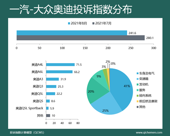 汽車質(zhì)量投訴點評:本月一汽-大眾奧迪跌落至第十位,投訴問題集中于奧迪A4L、奧迪A6L兩款暢銷車型,質(zhì)量問題集中于車身及電氣、變速箱、發(fā)動機層面,其中占比高達(dá)41%的車身及電氣問題主要表現(xiàn)為天窗漏水,奧迪A3、奧迪A4L、奧迪Q3均有涉及,變速箱異響也是一汽-大眾奧迪旗下車型普遍存在的問題。