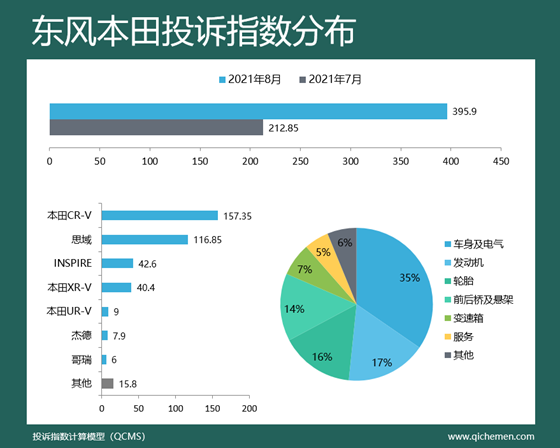 汽車質(zhì)量投訴點評:本月東風(fēng)本田投訴指數(shù)環(huán)比增長86%,排名升至第六位;投訴問題中車身及電氣層面占比較高,其他層面問題分布相對均衡,其中本田CR-V、思域、INSPIRE均深陷吃胎偏磨、起皮問題,2016款至2019款車型均有涉及;此外,本田CR-V天窗遮陽簾卡扣斷裂和本田XR-V冷車啟動異響也是車主集中投訴的焦點。