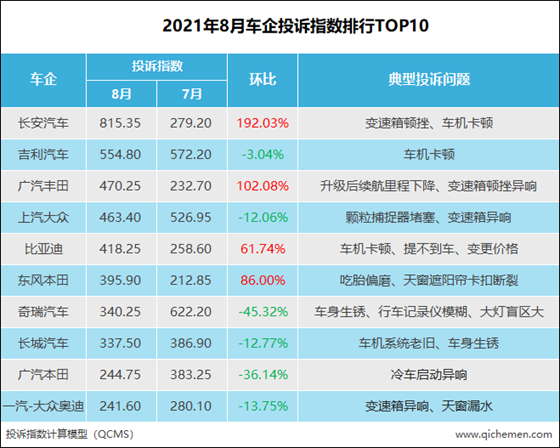 汽車質(zhì)量投訴點評:本月長安汽車投訴指數(shù)暴漲192.03%,躍居至第一位;長安汽車的所有投訴都集中在長安UNI-T一點,主要表現(xiàn)為變速箱頓挫、車機卡頓,據(jù)車主反饋長安UNI-T車機越升級越慢,全景影像也會伴隨出現(xiàn)卡頓現(xiàn)象,搭載的雙離合變速箱低速行駛時頓挫感明顯;其實,變速箱頓挫和車機卡頓問題在去年長安UNI-T上市不久便已出現(xiàn),只是在8月才出現(xiàn)集中性投訴,希望廠家關(guān)注后能妥善解決。