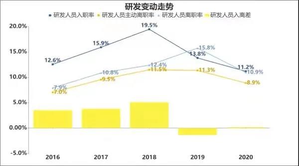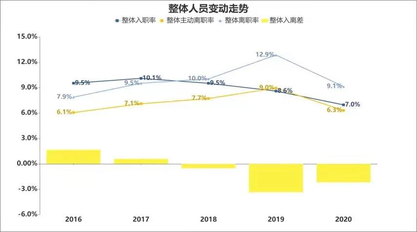 《用工對標(biāo)報告》顯示,2020年,全行業(yè)經(jīng)營情況繼續(xù)呈現(xiàn)下降態(tài)勢,相較2019年,銷量、收入、利潤和工業(yè)增加值持續(xù)下跌,與此同時,行業(yè)整體人員離職率也高于入職率,入離差同比2019年下降2.2個百分點(diǎn)。