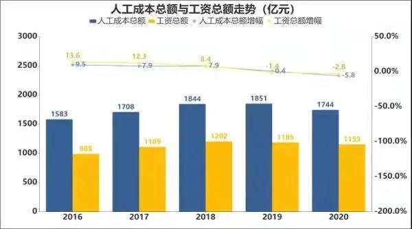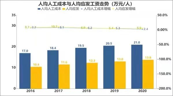 《薪酬對標(biāo)報告》顯示,在人員總量、行業(yè)人工成本總額和工資總額均呈現(xiàn)下降態(tài)勢的同時,由于人員數(shù)量降幅更大,因此人均人工成本和人均工資均出現(xiàn)了上升。其中,2020年汽車行業(yè)人均人工成本為21.0萬元/人,同比增長2.4%,人均工資則為13.8萬元/人,同比增長5.9%,值得一提的是,這兩項(xiàng)數(shù)值均低于近五年平均增長率(平均增長率分別為5.5%和7.2% )。