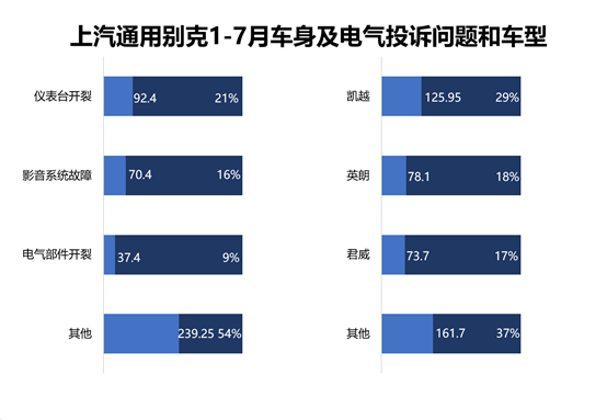 從車身及電氣方面來看,別克車身及電氣方面的主要問題是車身儀表臺開裂,這一問題占據(jù)了總問題的兩成左右。而圖中典型的三大問題占據(jù)到總問題不到一半,更多的是一些非典型問題。 從車型方面看,凱越、英朗和君威占據(jù)了總問題六成之多,這也是由于車型年款老導(dǎo)致的老化,所以車身及電氣方面問題頻發(fā)。