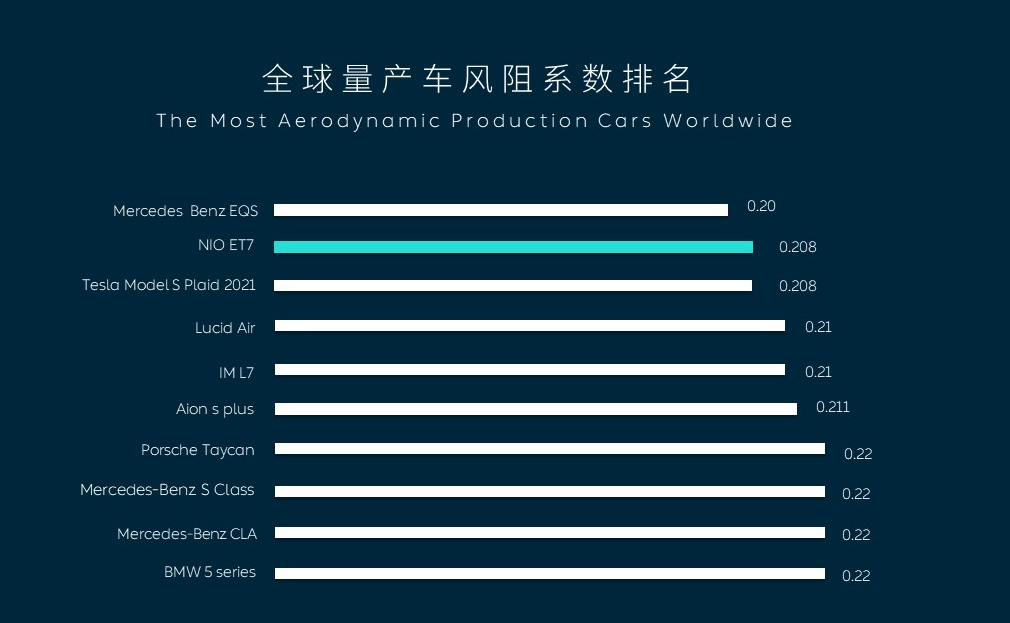 由此可見(jiàn),ET7這個(gè)0.208的風(fēng)阻系數(shù),實(shí)際上已經(jīng)達(dá)到了當(dāng)前量產(chǎn)純電動(dòng)車(chē)前二的水準(zhǔn)。即便將范圍擴(kuò)大到燃油車(chē)領(lǐng)域,也可以輕松名列前茅。