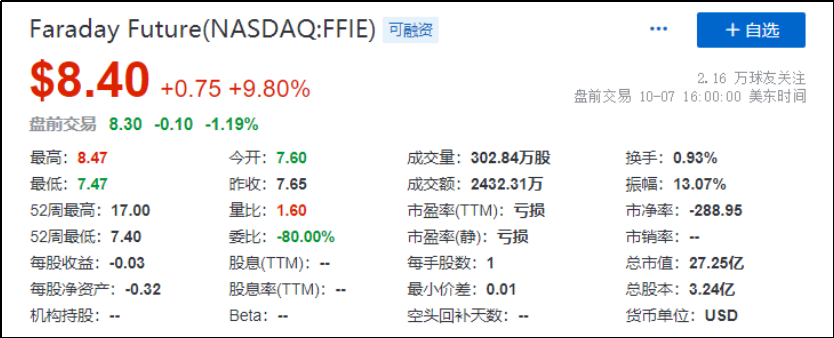 讓人迷惑的是,就在美奇金發(fā)布長(zhǎng)達(dá)28頁(yè)的沽空?qǐng)?bào)告后,FF不降反漲,截止8日,法拉第未來(lái)大漲10%,股價(jià)為8.4美元每股,市值約27億美元。