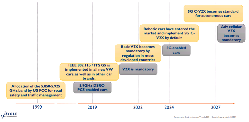 在連接性方面,2022年,大多數(shù)發(fā)達(dá)國家的法規(guī)規(guī)定,基本V2X為強制性執(zhí)行;2024年,無人駕駛汽車進(jìn)入市場,默認(rèn)情況下采用5G CV2X;2027年,5G C-V2X將成為自動駕駛汽車的標(biāo)準(zhǔn)配置。