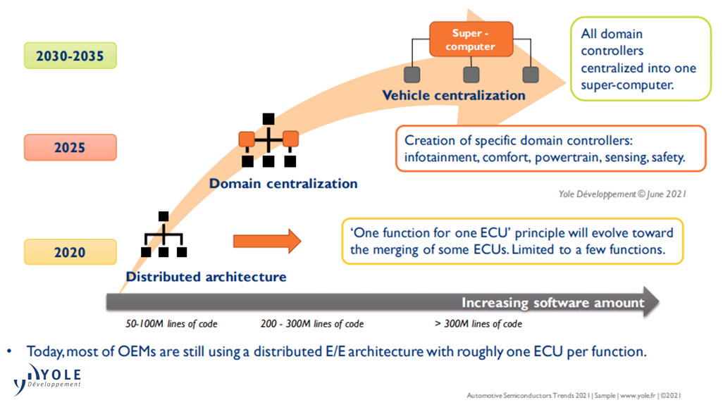 車輛中的軟件代碼將從5000萬行增加到1億行、2-3億行,甚至3億行以上。今天,大多數(shù)主機廠仍然使用分布式E/E體系結(jié)構(gòu),每個功能有一個ECU。