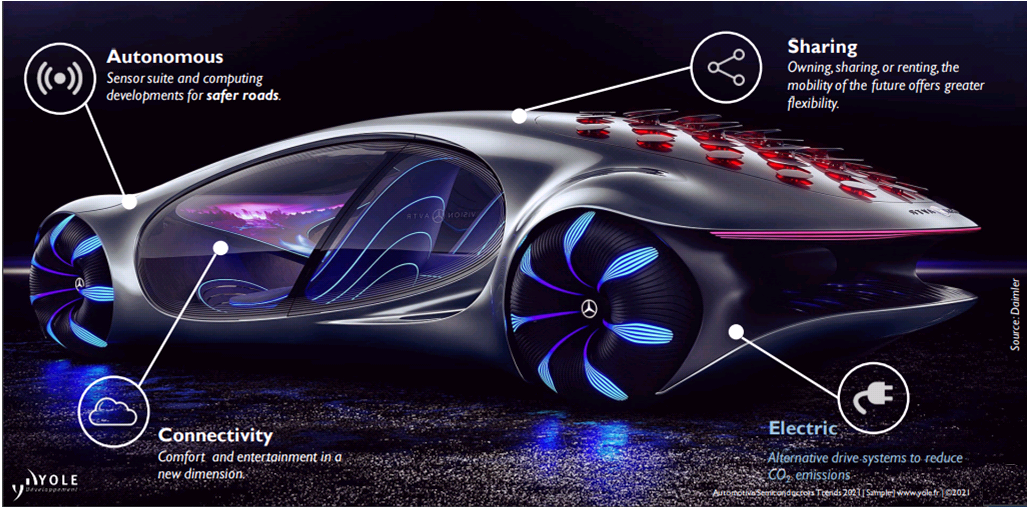 汽車的發(fā)展是由C.A.S.E.技術(shù)的發(fā)展推動的。Yole的分析師估計,C.A.S.E.相關(guān)電子模塊市場的演變趨勢體現(xiàn)在四個方面: