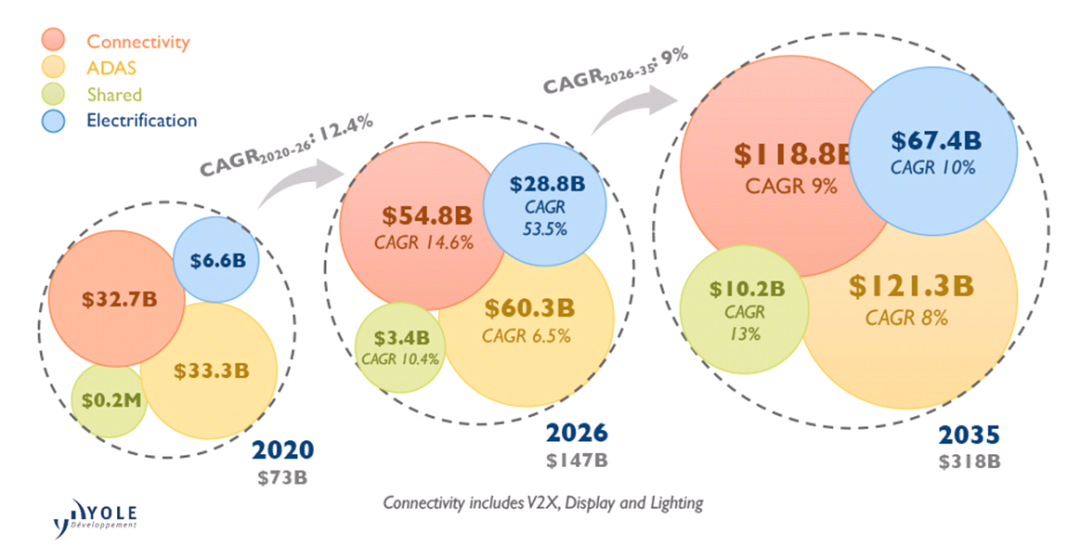 市場預(yù)測表明,到2035年,汽車C.A.S.E.(連接性、ADAS(高級輔助駕駛系統(tǒng))、共享、電氣化)將成為一個價值3180億美元的市場。半導(dǎo)體(芯片級)在汽車中的價值將在2026年達(dá)到785億美元,年復(fù)合年增長率為14.75%。
