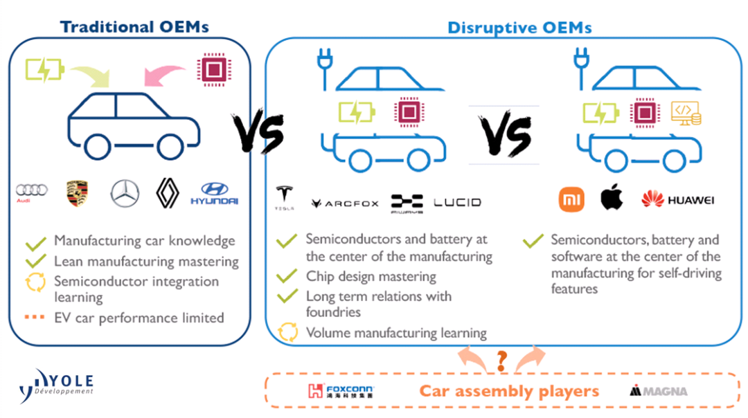 傳統(tǒng)主機廠知道如何制造汽車,精通精益制造;而顛覆性主機廠正在圍繞半導(dǎo)體、軟件和電池制造電動汽車。他們掌握芯片設(shè)計,并與代工廠建立了長期關(guān)系。但是,他們需要學(xué)習(xí)如何批量生產(chǎn)汽車,學(xué)習(xí)如何集成半導(dǎo)體。