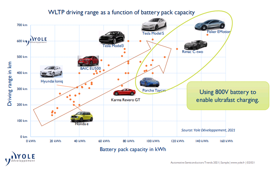 WLTP(全球統(tǒng)一輕型車輛試驗程序)行駛里程與電池組容量的關(guān)系表明,使用800V電池技術(shù)可以實現(xiàn)超快充電。