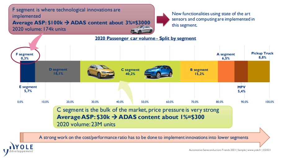 由于更高的汽車ASP(平均售價),F級別車輛是大多數(shù)創(chuàng)新首次實施的地方,采用最先進(jìn)的傳感器和計算技術(shù)實現(xiàn)新的功能。其平均ASP為10萬美元,ADAS內(nèi)容約為3%(3000美元)。這類車輛2020年銷量為17.4萬臺。