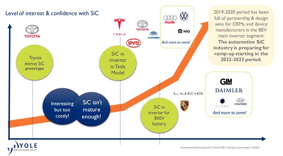 2019-2020年期間,BEV主逆變器領(lǐng)域的主機廠和設(shè)備制造商的合作伙伴關(guān)系和設(shè)計成果豐碩。汽車碳化硅行業(yè)正準(zhǔn)備在2022-2023年期間啟動量產(chǎn)。