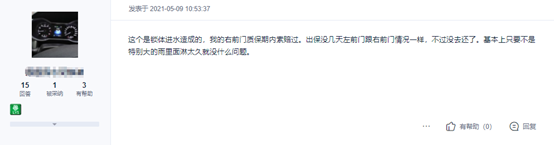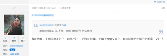 有網(wǎng)友表示,“雨天車門打不開”的問題可能是鎖芯進水導致的。因鎖體密封不嚴,下雨天鎖芯處可能出現(xiàn)積水,從而導致鎖扣不能回彈,車門無法打開。到了晴天因積水揮發(fā),門鎖就能正常使用了。還有車主稱有次試著把門把手擦干就好了。