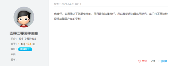 而對于這個被稱作2017款帝豪GL通病的問題,吉利廠家卻并未做出回復。對此有網(wǎng)友表示,“也難怪,如果承認了就要負責的,而且是負法律責任,所以我覺得先曝光再說吧。車門打不開這種奇怪故障國產(chǎn)車的專利”。