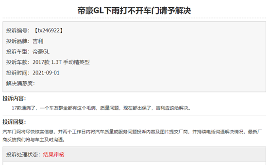 還有車主表示,“雨天車門打不開”的問題是2017款車型的通病,車友群里這個年款的帝豪GL都有這個毛病。