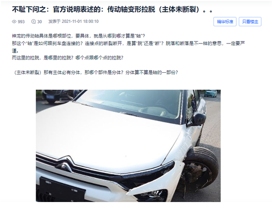 而對(duì)比來(lái)看,東風(fēng)雪鐵龍聲明中的受損車(chē)輛傳動(dòng)軸確為變形沒(méi)有斷裂,但現(xiàn)場(chǎng)圖片中只剩下傳動(dòng)軸防塵套的輪胎是否為假并未解釋。那么,聲明中的車(chē)輛與現(xiàn)場(chǎng)圖片中的車(chē)輛是否為同一輛車(chē)呢?不得而知。