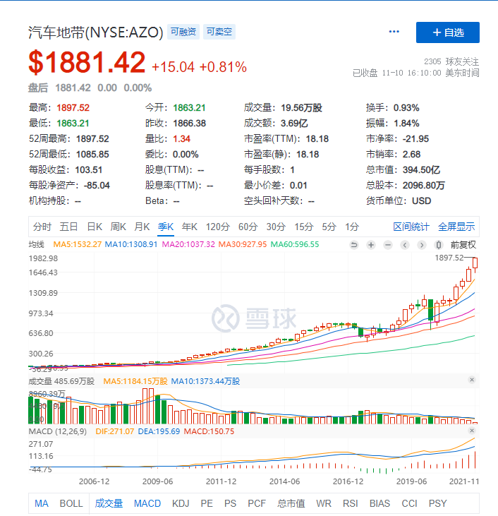 得益于穩(wěn)定的業(yè)績(jī)?cè)鲩L(zhǎng)、良好的自由現(xiàn)金流,美股上的零配件企業(yè)汽車地帶(NYSE:AZO)、奧萊利(NASDAQ:ORLY)、領(lǐng)先汽車配件(Advance Auto Parts(NYSE:AAP)都是10年10倍以上的大牛股。