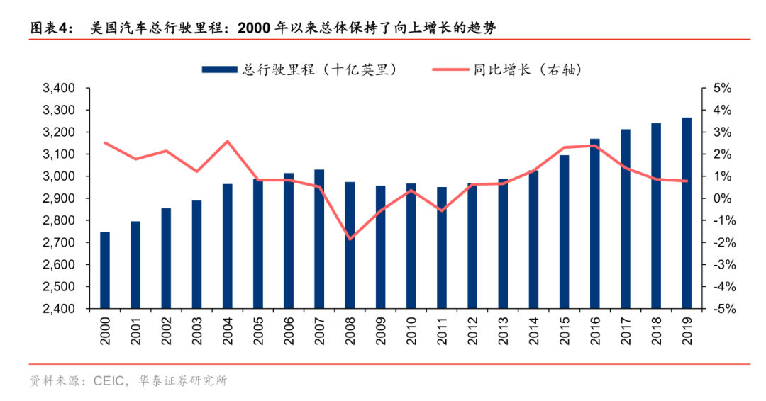 2.汽車總行駛里程的增加:2000-2019 年復(fù)合增長(zhǎng) 0.9%。車輛行駛里程的增長(zhǎng),帶動(dòng)了售后零配件以及維修服務(wù)的需求,因?yàn)槠嚨膿p耗主要是行駛里程造成的。
