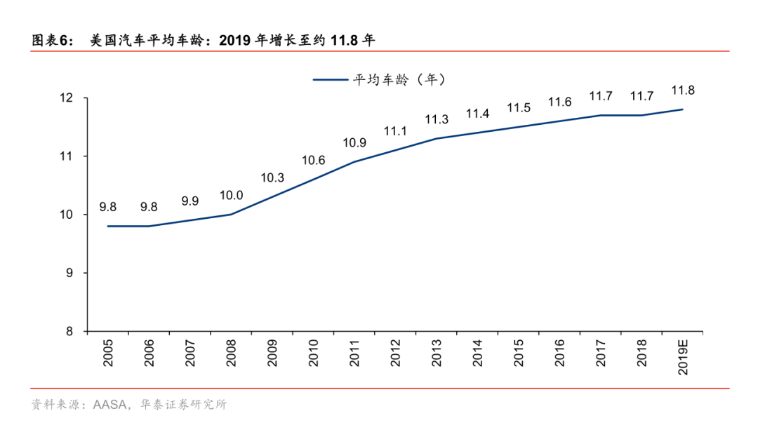 3.平均車齡的增加導(dǎo)致每年維修保養(yǎng)支出增長(zhǎng):平均車齡從 2000 年的 9.8 年,上升至2019 年的11.8 年。