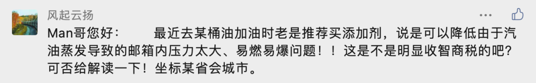 上周問答提到了燃油添加劑,有朋友留言補充提問: