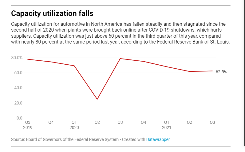 近年來,北美地區(qū)輕型汽車的產(chǎn)能利用率一直在穩(wěn)步下降,并且,自2020年下半年新冠肺炎疫情導(dǎo)致工廠停產(chǎn)后又重新開工以來,一直處于停滯狀態(tài)。根據(jù)圣路易斯聯(lián)邦儲備銀行(Federal Reserve Bank of St. Louis)的數(shù)據(jù),今年第三季產(chǎn)能利用率略高于60%,去年同期則為近80%。