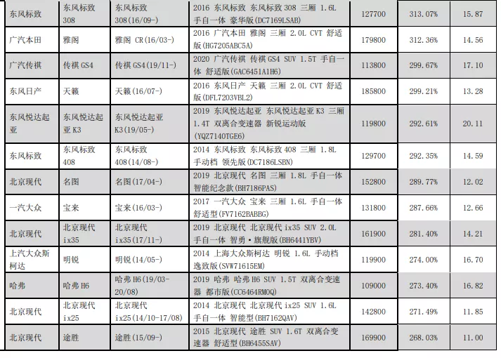 零整比系數(shù)最高的是廣汽本田的思迪/鋒范,有421.78%;接下來是廣汽本田的車型飛度,407.9%。