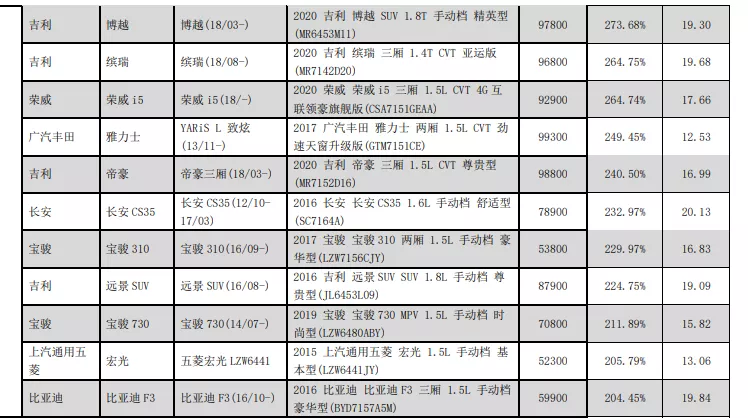 零整比系數(shù)最低的是比亞迪F3,只有204.45%。